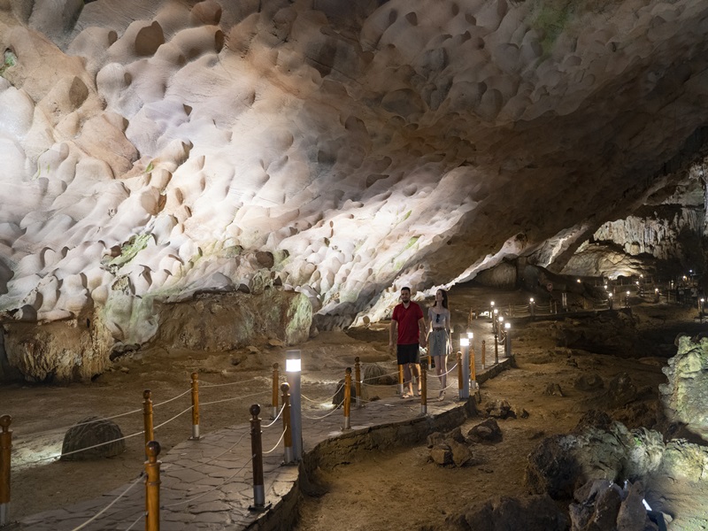 - 11.45: Discover Sung Sot Cave, the largest and most beautiful cave of Ha Long Bay. The cave also offers a variety of unique shaped stalagmites that are nowhere to be found. The path to Sung Sot cave lies beneath the forest canopy with stone steps perched on the rocky cliff, which will delight you with the pleasure of climbing and the excitement as if you are heading to the sky.